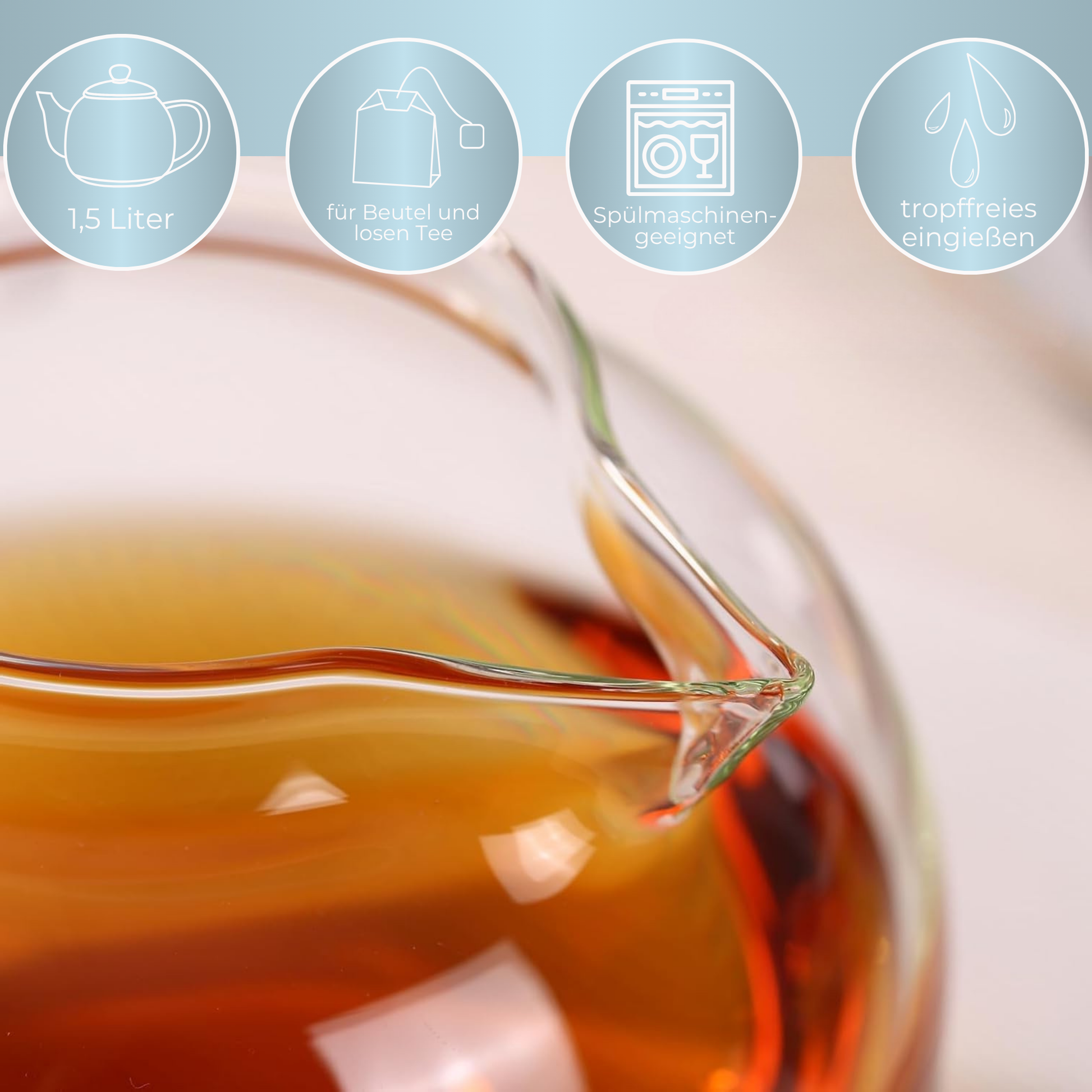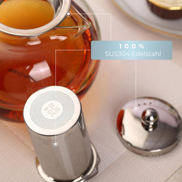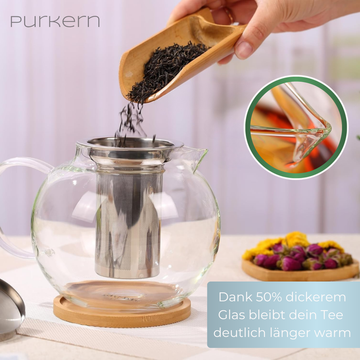 Die PURKERN™ Teekanne kombiniert hochwertiges Borosilikatglas mit 100 % Edelstahl für ein stilvolles, langlebiges Design. Ihr extra dickes Glas hält den Tee länger warm, während das präzise entwickelte Ausgießsystem für ein tropffreies Einschenken sorgt.